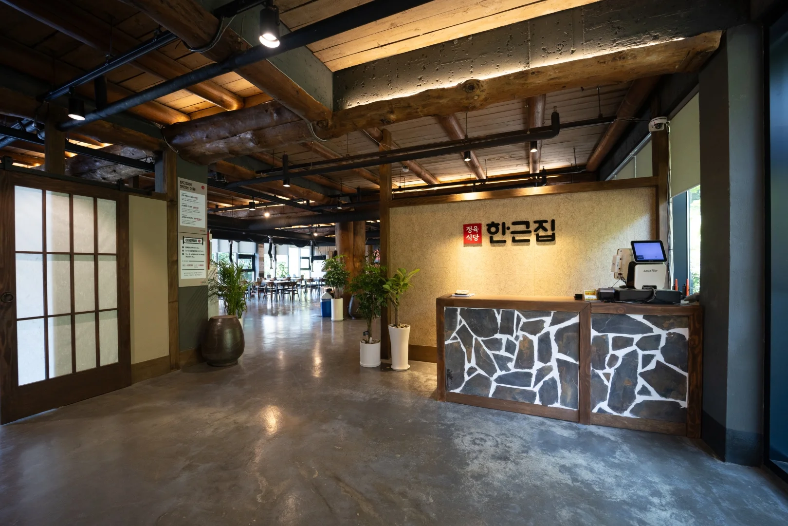 이번 프로젝트는 한식당 리모델링과 전통 감성 인테리어를 결합한 프리미엄 한우 레스토랑 공간 디자인으로 진행되었습니다. 외관은 너와지붕재, 철평석 마감을 통해자연스럽고 단단한 한국적인 이미지로 완성했습니다. 특히 목재 수작업 가공과 몰재살문 슬라이딩도어 디테일은 장인의 손길이 느껴지는 정제된 분위기를 만들어냅니다.