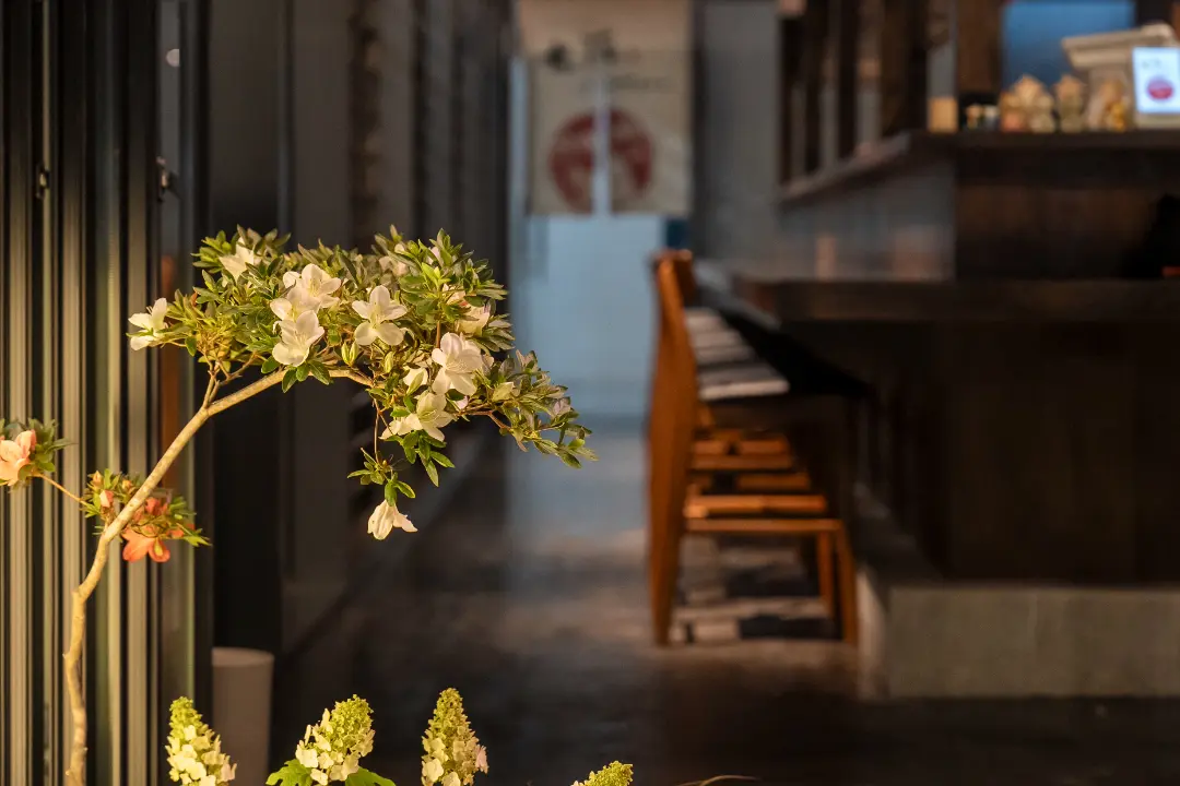 외관은 마치 일본의 오래된 골목 안주점을 떠올리게 하는 녹을내어 만들어낸 빈티지 함석 지붕과 원목 파사드, 그리고 수작업으로 완성된 핸드메이드 목재 디테일이 포인트예요.